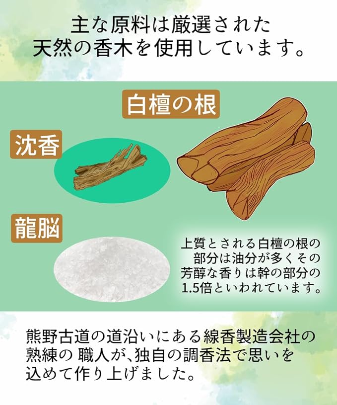 主な原料は、白檀の根の部分を使用した厳選された天然の香木です。上質とされる白檀の根は油分が多く、幹の部分より1.5倍ほど芳醇な香りが特徴です。沈香と龍脳を配合し、熊野古道沿いの線香製造会社の熟練職人が独自の調香法で心を込めて作り上げました。