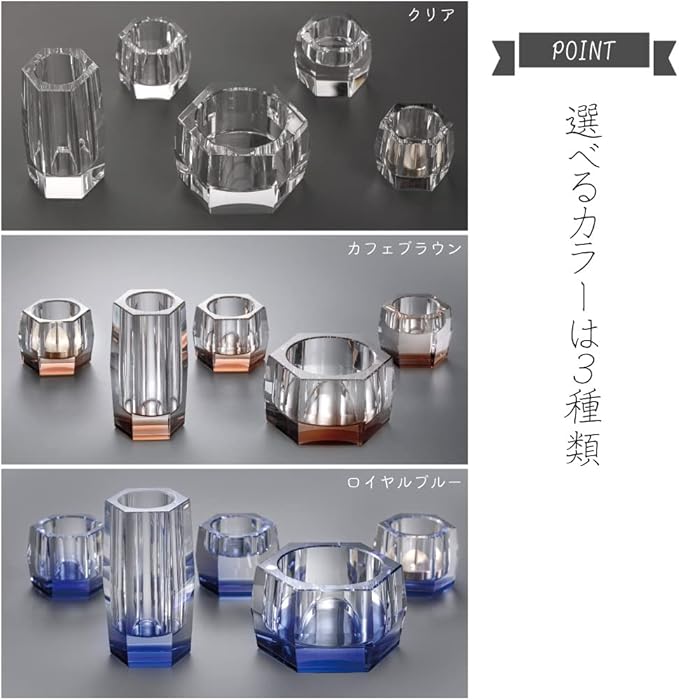 クリア・カフェブラウン・ロイヤルブルーの3色をご用意しています。