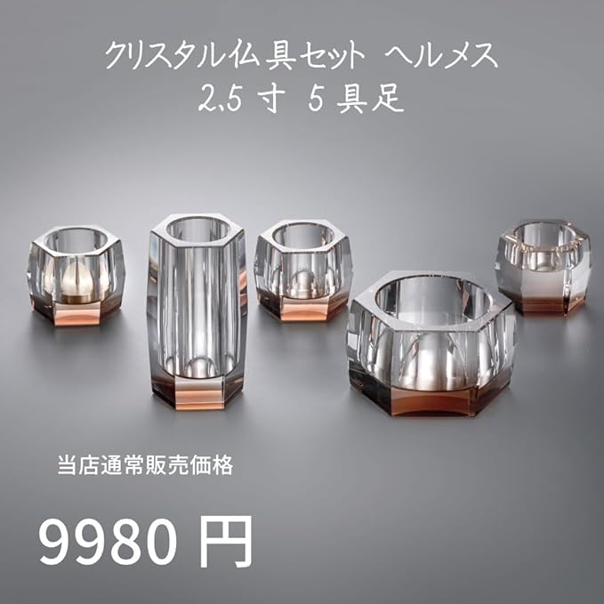 クリスタル仏具:香炉、花立、蝋燭立て、茶湯器、仏飯器 2.5寸