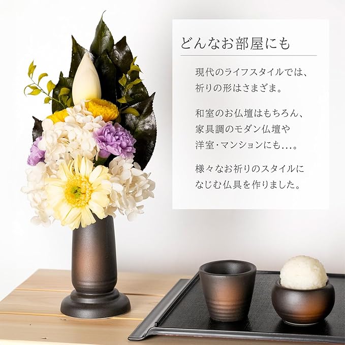 【純国産】日本製。こだわりの「純国産仏具」です。落ち着いた備前焼調の陶器は、さらっとした落ち着いた質感。家具調のモダンな仏壇や、洋室やマンションにも馴染みます。焼き物の一大産地、愛知県瀬戸市で職人がひとつひとつ丁寧に作成します。