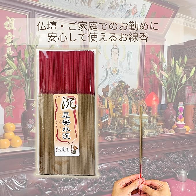 I H INCENSE HOUSE+ の惠安沉香(けいあんじんこう)は、ベトナム産(越南産)の惠安系沈香粉を主原料に、天然の樹脂系原料と厳選した茶竹(ちゃたけ)製の竹芯を用いて仕上げた供養用線香です。 台湾では、寺院や家庭の仏壇において、日々の祈りや供養のために線香を焚く習慣があります。本品は、そのような台湾の伝統的な供養文化に基づいて作られた線香です。惠安沉香ならではの、やわらかく澄んだ中に奥行きを感じさせる、上品で静かな香り立ちが特徴で、香りの質感を大切にしたい家庭の仏壇や佛堂での使用に適した香調となっています。 線香は細身の竹芯タイプで、一般的な太めの線香に比べて、煙は比較的穏やかです。長時間の読経や日常のお勤めでも、空間にやさしく馴染みます。天然原料を組み合わせた台湾伝統の製香配合を用い、長年培われた製香技法により、安定した燃焼と香りの持続を重視しています。300g入り(約380~400本)で、香材の質を重視する方向けの沈香系供養線香としておすすめです。 ※天然原料および手作業工程を含むため、香り・色合い・太さにはロットごとの個体差が生じる場合があります。