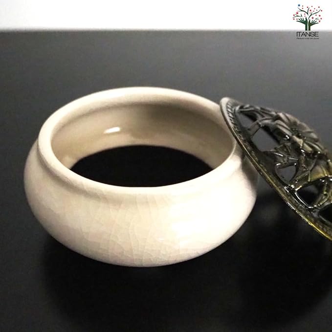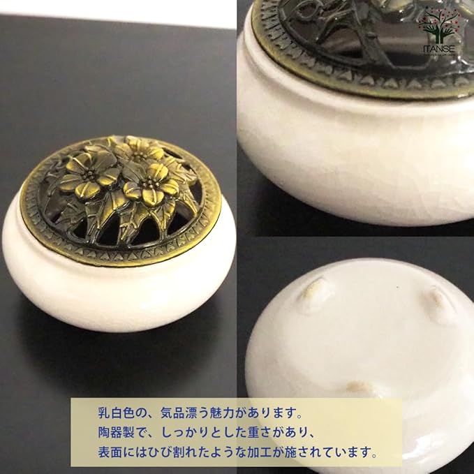 【お読みください】 火気には十分に注意してご使用ください。 お子様やペットの手が届かない場所に保管してください。 陶器製ですので、衝撃を加えると割れることがあります。取扱いには注意してください。 お香の量や種類によっては、使用後、金属製の蓋が熱を持っている可能性があります。ご注意ください。 使用後は、換気を十分に行ってください。 スマホ画面やPC画面の設定などにより、お届け時に掲載画像と少し異なったイメージ・色目になる場合があります。ご了承ください。