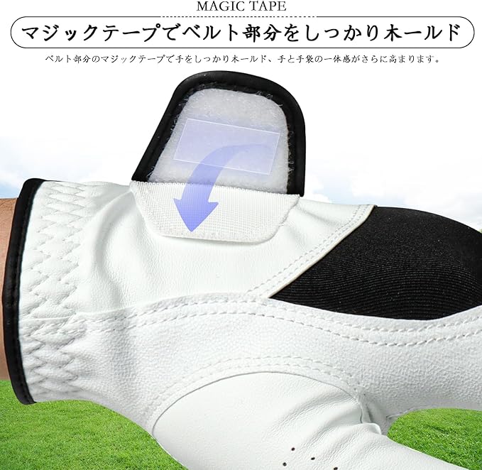 P2.強力グリップ:しっとりとした ミクロファイバーレザーと羊革で、強力なグリップ力を発揮。伸縮性のある素材により、幅広い動きが可能で、長時間のラウンド中の疲れを軽減します。