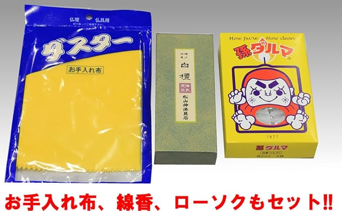 【日々の消耗品やお手入れ用品もセット】これまで仏壇を置いたことがなく、線香、ロウソクも一切お持ちでない方も安心。 白檀の線香、人気の短いサイズのロウソク(安全です)、そして日々のお手入れに必要なお手入れ布もセット。到着したその日からお仏壇のある生活を始めていただけます。