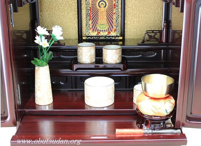 松山神仏具店 上置ミニ仏壇16号 高49.5cm 幅39cm 奥25cm モダン仏具ゆい花 (丸香炉) 一式セット 日蓮宗