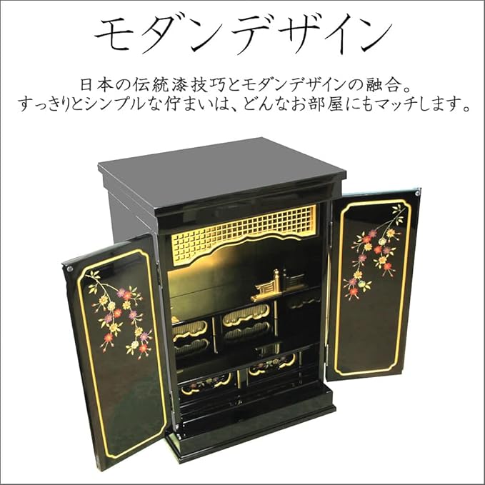 【金仏壇をモダンスタイルに】ミニ仏壇、モダン仏壇に伝統技法を詰め込んで。塗りモダン仏壇の完成です。現代の住環境とニーズに合わせたコンパクトサイズ、モダンスタイル。その中に日本の格式美をぎゅっと詰め込んで、伝統派もモダン派も納得のミニ仏壇に仕上がりました。
