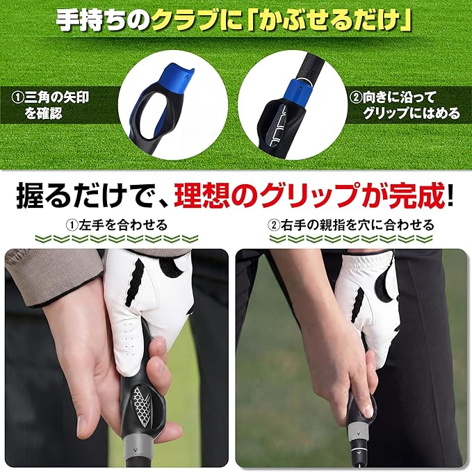 ✅【手持ちのクラブに「かぶせるだけ」の簡単装着】 お使いのゴルフクラブにサッと被せるだけで、使い慣れたクラブが練習用具に早変わり。三角の矢印を確認、向きに沿ってグリップにはめるだけ。コンパクトかつ軽量(約24g)なので、ゴルフバッグのポケットに入れて持ち運びやすく、練習場やラウンド前のウォーミングアップにも最適です。