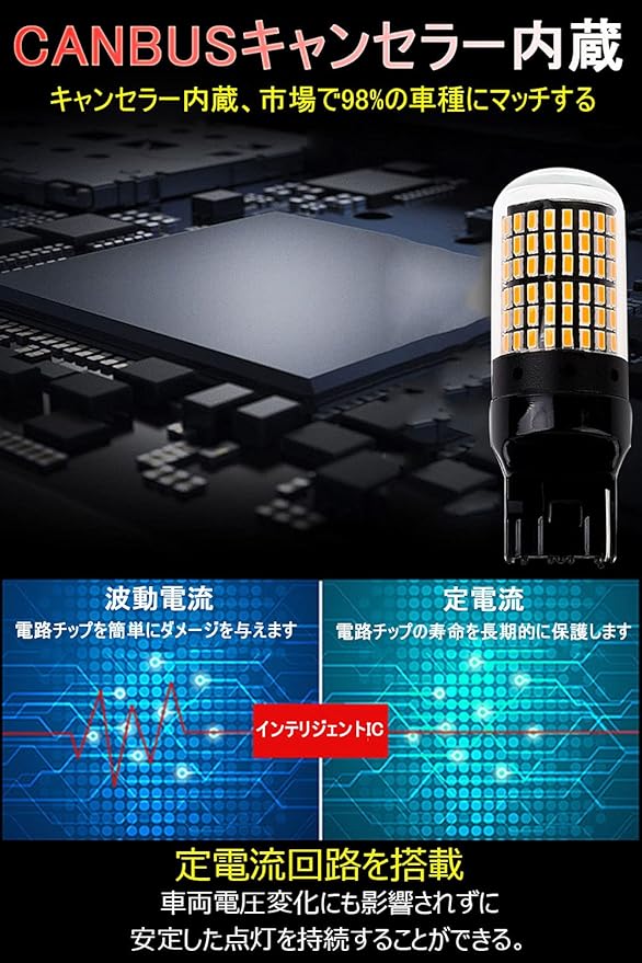 T20 シングル LED ウインカー アンバー オレンジ イエロー 高輝度 シングル led キャンセラー内蔵 t20 LED 7440バックライト 144連3014SMD無極性 12V用 50000時間以上寿命 2個入り