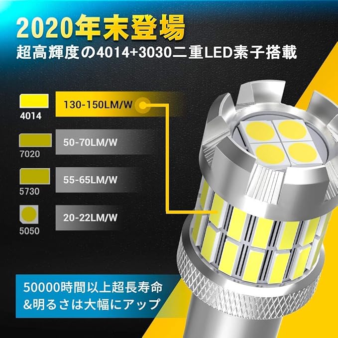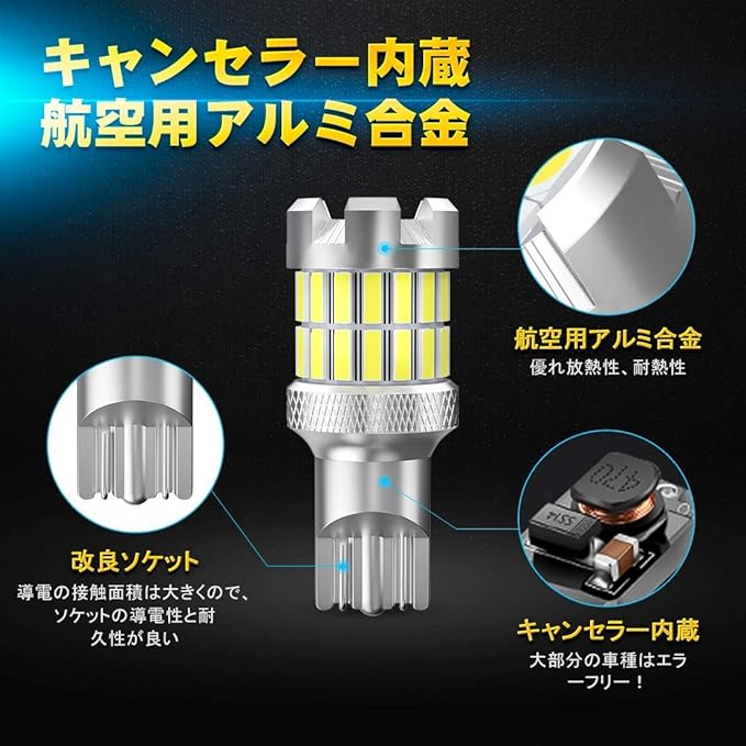 【製品仕様】ソケット形状:T15/T16用、LEDチップ:34連3030+4014LED、極性+-:無極性、消費電力:約4.8W、電圧:12V、ルーメン:1400LM、発光色:ホワイト、使用寿命:50000時