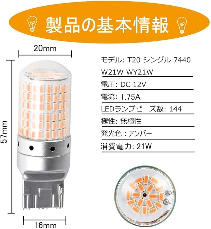 【最新型のデザイン】 純正T20サイズ箇所で利用した144LEDが持っています、爆光が大幅に向上しました。ウインカー、コーナーランプ、ターンシグナルランプなどの所を使うことができます。極性はありません、極性の確認が不要です。取り付けも簡単、数分の時間は完成できます。