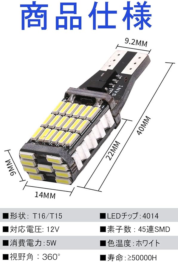 広範囲照射・360度発光:T16 LED バックランプは、全方向360度を明るく照らす設計で、45個の高輝度4014チップを搭載。内部には安定性に優れた抵抗を内蔵し、CANバスエラーを防ぐ設計。T15/W16W互換の高温対応ベースで、多くの車種の従来型ハロゲンや白熱球(906, 921, 922など)と交換可能。