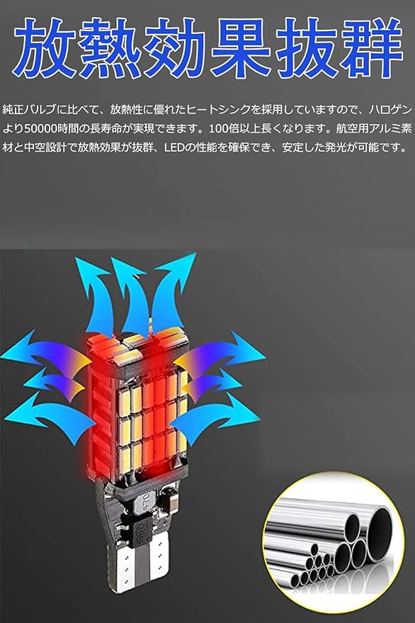 高耐久・優れた放熱性能:航空機用アルミニウムと中空構造を採用したヒートシンクで、優れた放熱性を実現。寿命は約50,000時間と、ハロゲン球よりはるかに長寿命です。