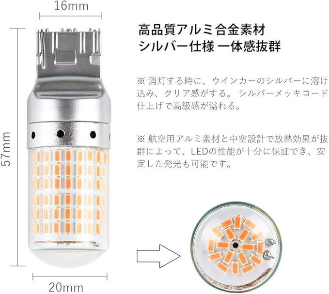 【商品仕様】口金タイプ:T20 シングル 7440 W21W WY21W ピンチ部違い / 発光色:アンバー / LEDチップ:3014SMD / LEDチップ数:144連 / 入力電圧:DC12V / 電流:1.75A / 消費電力:21W / 極性:無極性 / サイズ(約):全長57mm 最大直径20mm 差込口幅16mm / 保証:100日保証。(※ご購入前に、必ずバルブのサイズや差込口の形状、タイプの確認をお願いします。)