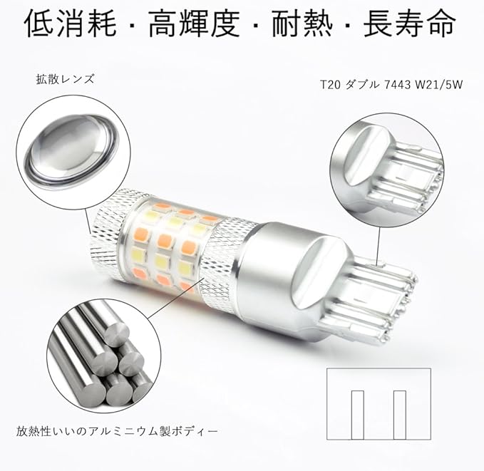 1797 T20 ダブル LED 7443 W21/5W アンバー ホワイト 2色 LEDバルブ ウインカー ポジション スモールランプ オレンジ 白 ツインカラー 変換 ウェッジ ダブル球 LEDライト ランプ バルブ コーナーランプ 2835SMD 42連 高輝度 拡散レンズ付き 2個セット