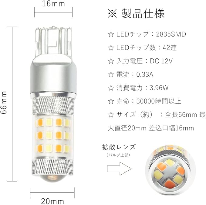 【製品仕様】LEDチップ:2835SMD / LEDチップ数:42連 / 入力電圧:DC 12V / 電流:0.33A / 消費電力:3.96W / サイズ(約) :全長66mm 最大直径20mm 差込口幅16mm / パッケージ内容:LEDバルブ 2、100日保証書 1 / 用途:ウインカー コーナーランプ ターンシグナルランプの交換に最適。※ご注意:全ての車種において動作保証は出来ません。ごく一部の車種ではハイフラ現象が解消されない 可能性が有ります。車種によってハイフラッシング現象が発生してしまう可能性があります。基本的にはハイフラッシング現象は、抵抗器で解消できます。対策品はサイト上で「ハイフラ防止抵抗器」を検索してご覧いただけます。万が一、点灯しないなどの不具合がございました場合は、Futwodサポートまでご連絡ください。