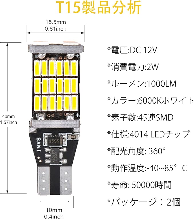 T16 T15 W16W LED バックランプ 爆光 12V汎用 45連4014SMD 無極性 後退灯 テールランプ バックライト 50000時間以上寿命 ホワイト (2個セット)