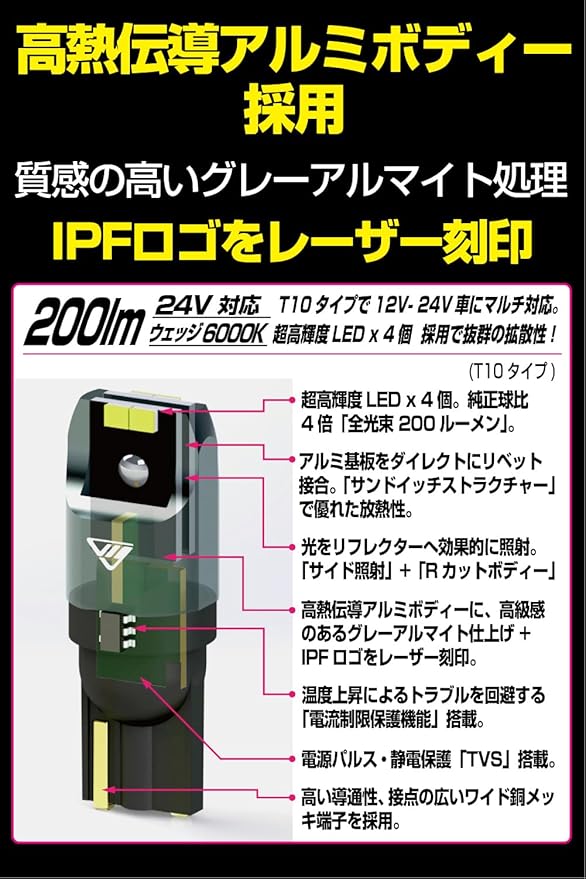IPF ポジションランプ LED 車用 T10 200lm 6200K ホワイト 12V24V兼用 2本入 車検対応 保護回路搭載 両サイド照射 ワイド銅メッキ端子 明るさ純正球比4倍 506W