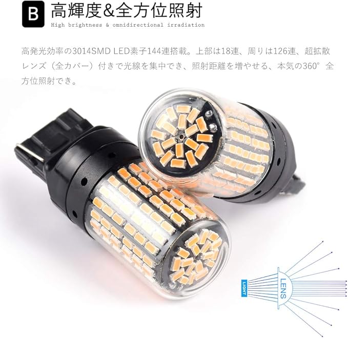 T20 シングル LED ウインカー アンバー オレンジ イエロー ピンチ部違い 7440 W21W WY21W LEDバルブ ウィンカー バルブ コーナリング ランプ 変換 ウェッジ シングル球 LED電球 ハイフラ防止 キャンセラー内蔵 超拡散レンズ付き 12V 車用 3014SMD 144連 無極性 高輝度 2個セット