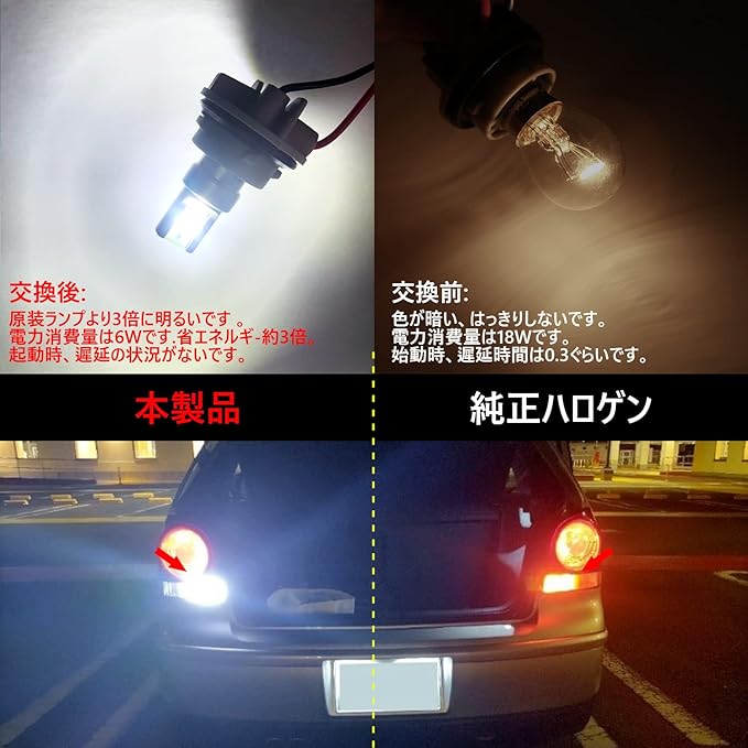 【1500LM/個超高輝度】後退灯専用高品質CSP2020 LEDチップ6個搭載、死角のない360度全方位照射仕様、ハロゲンより明るさが3倍で!。バック時の視野は純正より大幅広くなる、後方の障害物をはっきり見える。