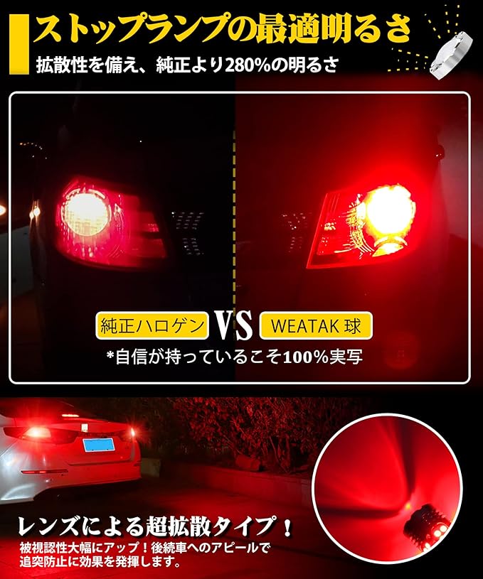 【ブレーキランプ最適の高輝度】後続車へのアピールできため超拡散レンズ付き、ムラのない全方位照射。純正より280%の明るさ、昼でもフォグや雨の日でも高い視認性がある。97%以上超高発光効率、同等の明るさの上でハロゲン球より55%省エネ。