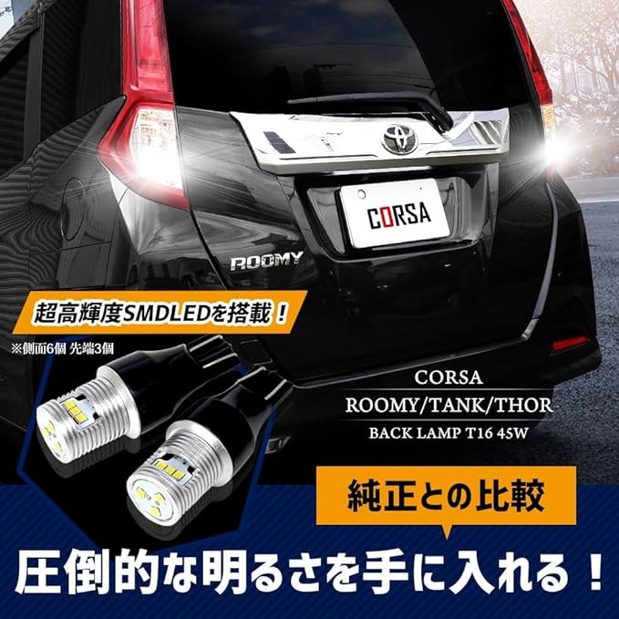 CORSA ルーミー タンク トール LED バックランプ T16 45W 560lm ウェッジシングル球 ホワイト 後退灯 高輝度 省電力 1120LM カスタム パーツ アクセサリー ドレスアップ ROOMY TANK THOR [2] M