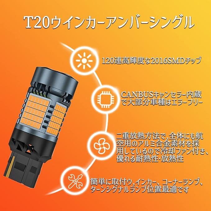 7440 T20 ピンチ部違い led ウインカーバルブ 日本車専用 車検対応 冷却ファン搭載 キャンセラー内蔵 120連SMD2016チップ T20 シングル T20ピンチ部違い兼用2個入り
