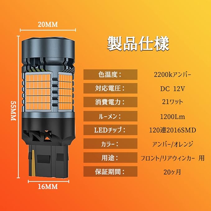 【製品仕様】口金タイプ:T20 シングル 7440 W21W WY21W ピンチ部違い / 発光色:アンバー / LEDチップ:1206SMD / LEDチップ数:120連 / ルーメン:1200LM / 入力電圧:DC 12V / 消費電力:21W / サイズ(約):全長55mm 最大直径20mm 差込口幅16mm / パッケージ内容:LEDバルブ 2。