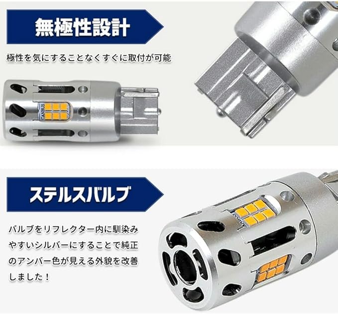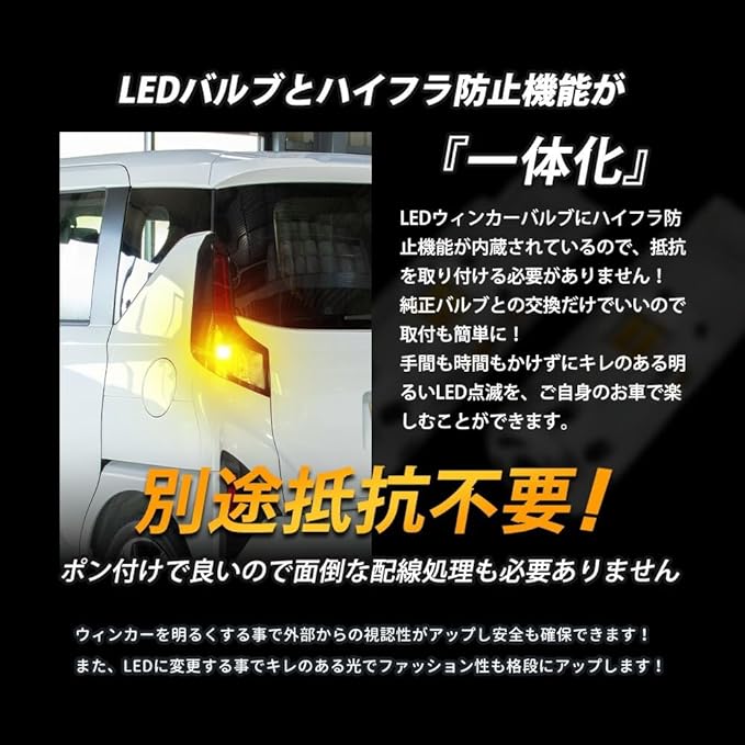 ✅ 抵抗内蔵でハイフラ対策不要:バルブ本体にハイフラ防止機能を内蔵。外付け抵抗やリレー交換は不要で、純正バルブと交換するだけのポン付けLED化が可能です。
