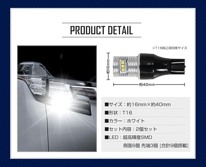 TOYOTA ALPHARD VELLFIRE 30 専用 T16 LEDバックランプ 45W 2個セット 【圧倒的な光量で後方視認性を向上】超爆光45W 560LM:超高輝度SMD LEDを9基(側面6個・先端3個)搭載。純正球を凌ぐ高い光量を実現。
