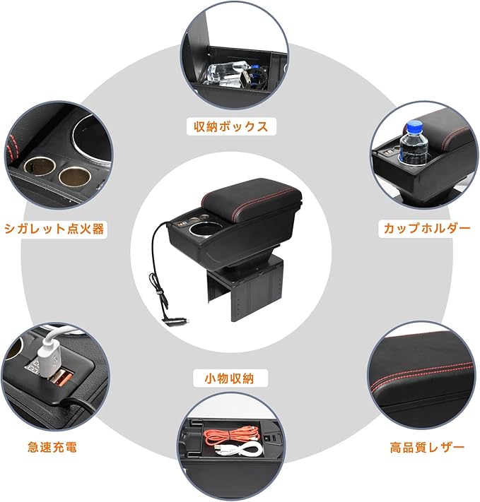 アームレスト コンソールボックス 車内多機能 車用収納ボクス ティッシュ収納 ホルダー 車肘置き USBポート 取付簡単 落下防止 疲労を軽減 高速充電型