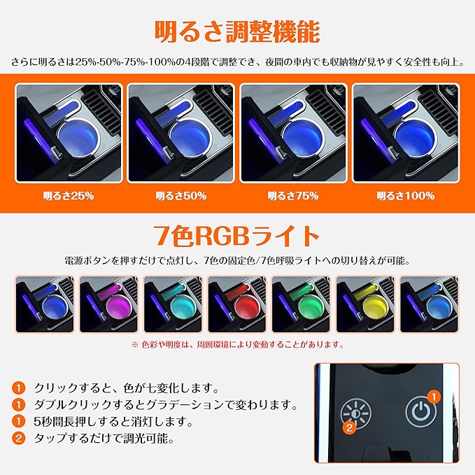 【7色RGBライト|夜間も見やすい&雰囲気アップ】 コンソール内部とドリンクホルダーに 7色RGB変換ライト を搭載。電源ボタンを押すだけで点灯し、7色の固定色/7色呼吸ライトへの切り替えが可能。さらに明るさは 25%-50%-75%-100% の4段階で調整でき、夜間の車内でも収納物が見やすく安全性も向上。インテリアを彩る コンソールボックス としても魅力的です。