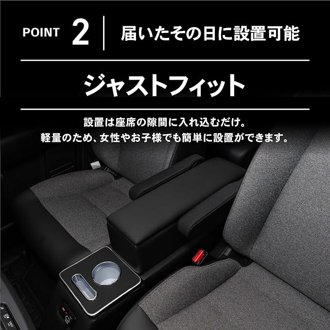 Point2 「ジャストフィット」 設置は座席の隙間に入れ込むだけ。 軽量のため、女性やお子様でも簡単に設置ができます。 Point3 「走行中のズレなし」 実車の形状に合わせて設計を行っているので 細部までフィットします。
