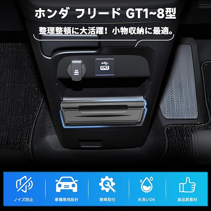 【対応車種】新型 ホンダ フリード GT1/2/3/4/5/6/7/8型。年式2024.6~現行。車種ごとの精密なサイズ設計により、純正収納ボックスにぴったりフィット。違和感なく車内に馴染み、高級感をプラスします。