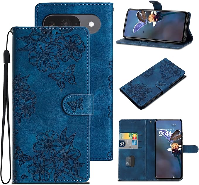 for Google Pixel 10/10 Pro ケース 手帳型 Pixel 9/9 Pro ケース 財布型 グーグルピクセル10スマホケース Googleピクセル10 Pro 携帯カバー 花柄 カード収納 高級レザー 耐衝撃 全面保護 スタンド機能 ストラップホール付き おしゃれ桜蝶 ストラップ - ブルー