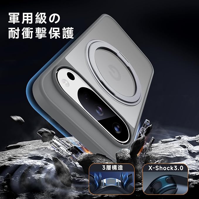 【米軍MIL規格・Magsafe対応】Google Pixel 10 Pro XL 用 ケース MagSafe対応 リング360 回転スタンド機能 縦横両対応 半透明 黄ばみ防止 ワイヤレス充電 レンズ保護 耐衝撃 携帯カバー 6.8 インチ マグネット搭載 車載ホルダー マグセーフ対応 おしゃれ (グレー)