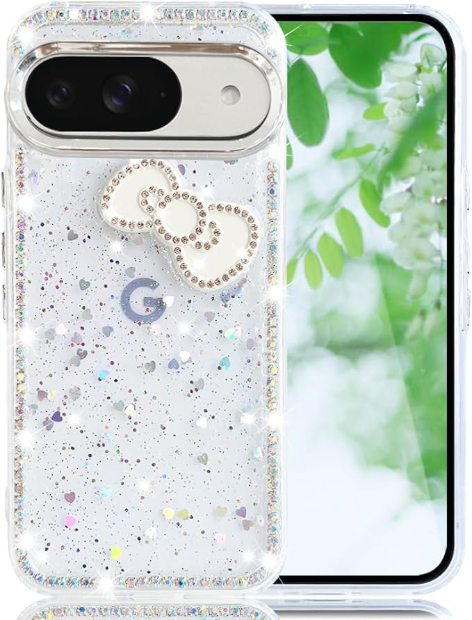 [YUYIB] スマホケース 対応 Google Pixel 9 / 9Pro / 10 / 10Pro 兼用 クリアケース 透明 キラキラ ドリル フラッシュ リボン ハート かわいい TPU 傷防止背面 滑り止め 衝撃吸収 おもしろい キャラクター ストラップ穴 グルピクセル10 Pro 携帯電話カバー (ホワイト, Pixel 9/9Pro/10/10Pro)