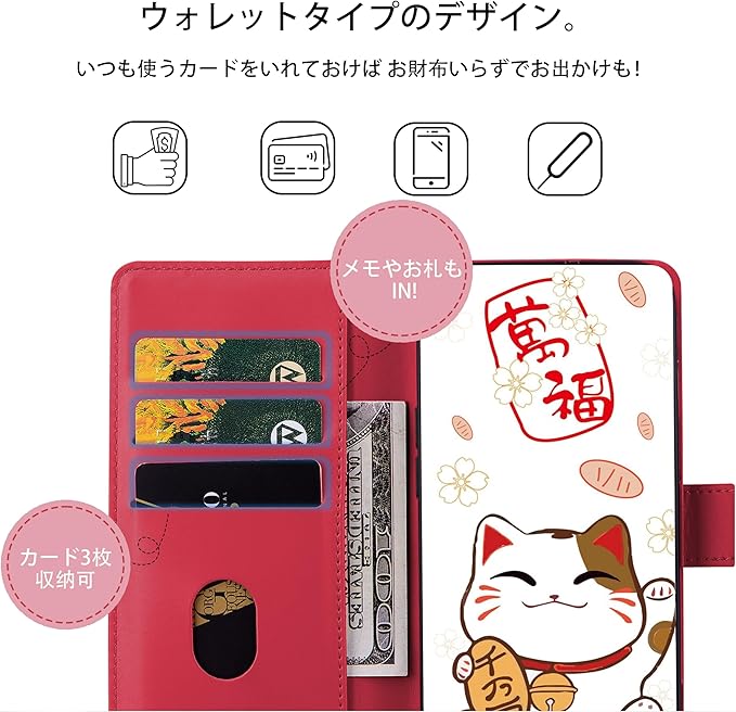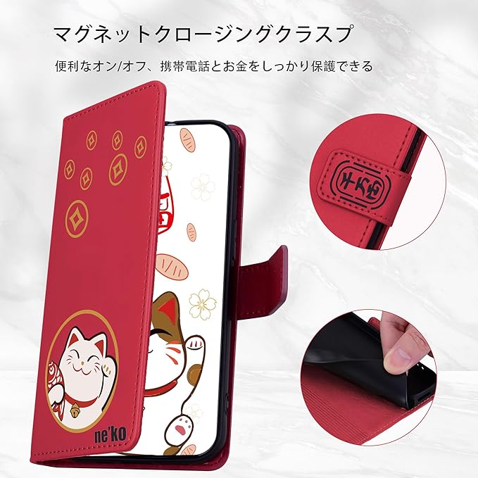 for Google Pixel 10/10 Pro ケース 手帳型 招き猫 Pixel 9/9 Pro ケース カード収納 グーグルピクセル10 スマホケース 耐衝撃 googleピクセル10 カバー 幸運な猫 PUレザー pixel 10 pro カバー 財布型 ピクセル9 スマホカバー スタンド機能 マグネット式 全面保護 ストラップ付き かわいい (レッド)