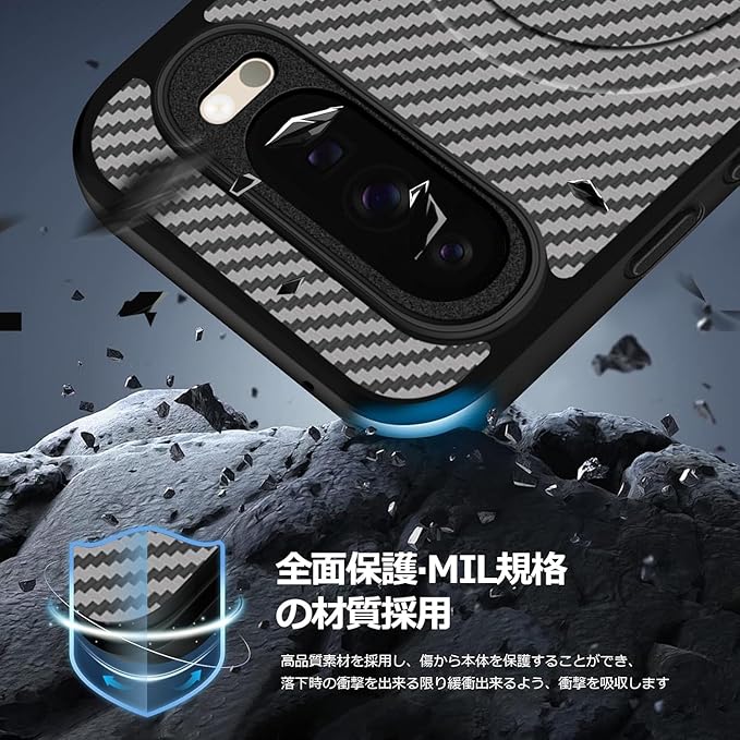 【高耐久のマット素材】通过从外壳背面到侧面实施碳色调的握持纹理,不易滑动,提高了易持性。装脱着が簡単になる柔らかいTPU素材に衝撃を吸収するエアクッションを適用し、極めた保護力でデバイスを守ります。