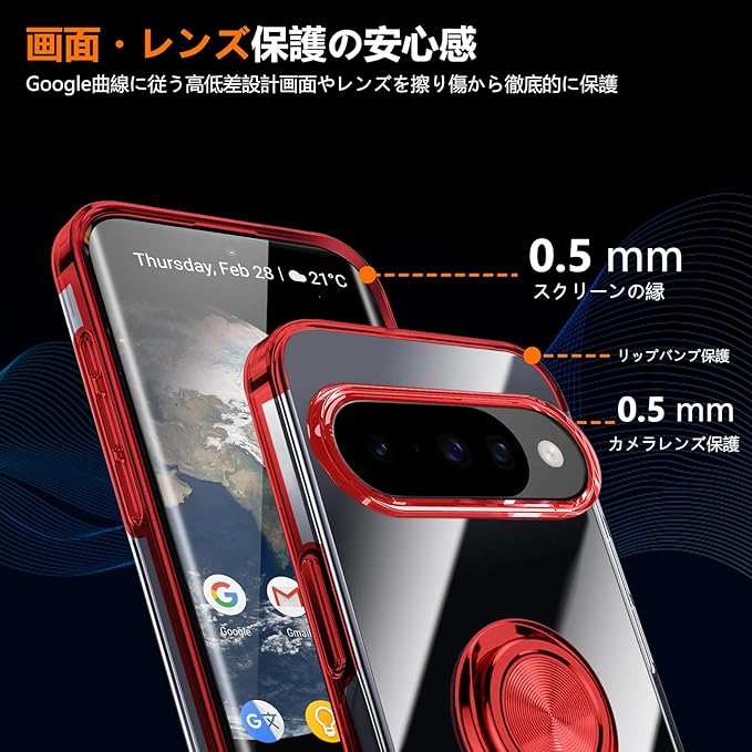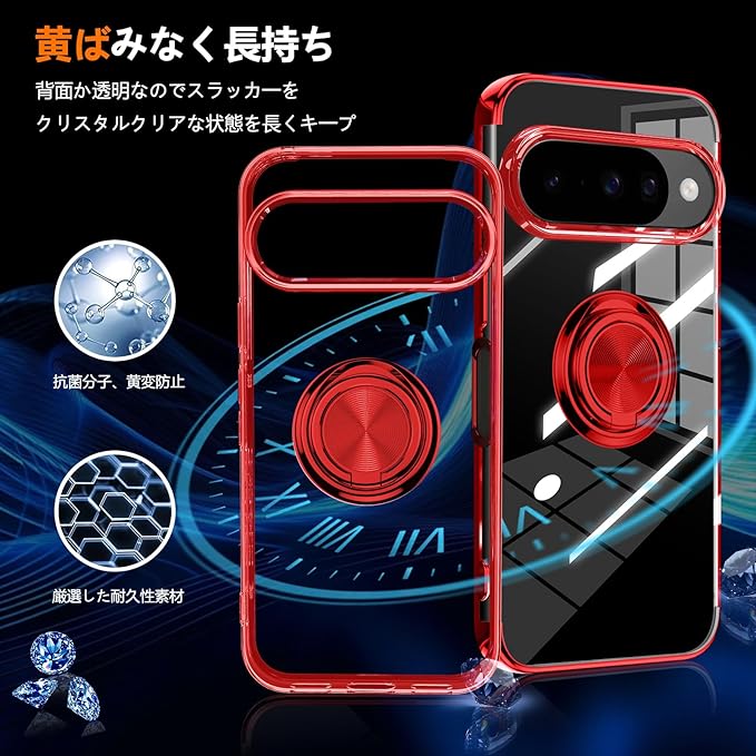 Google Pixel 10 用 ケース Pixel 10 Pro 用 ケース リング付き クリア 耐衝撃 スタンド機能 透明 TPU 車載ホルダー対応 落下防止 防塵 薄型 軽量 一体型 変形防止 保護カバー ピクセル 10/ピクセル 10 Pro 用 カバー 赤 W-YXZH-86-02