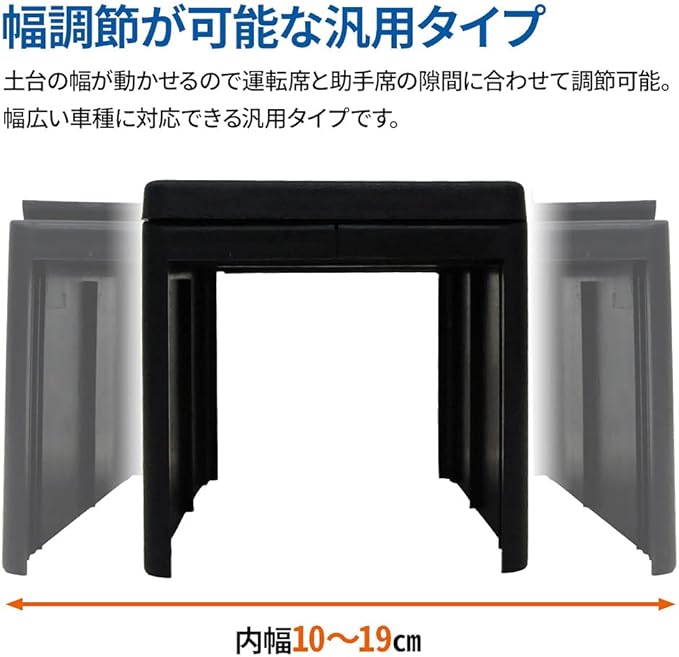 幅調節が可能な汎用タイプ/土台の幅が動かせるので運転席と助手席の隙間に合わせて調節可能。幅広い車種に対応できる汎用タイプです。高さ調節が可能/部品をひとつ付け外すことによって約5cmの高さ調節が可能