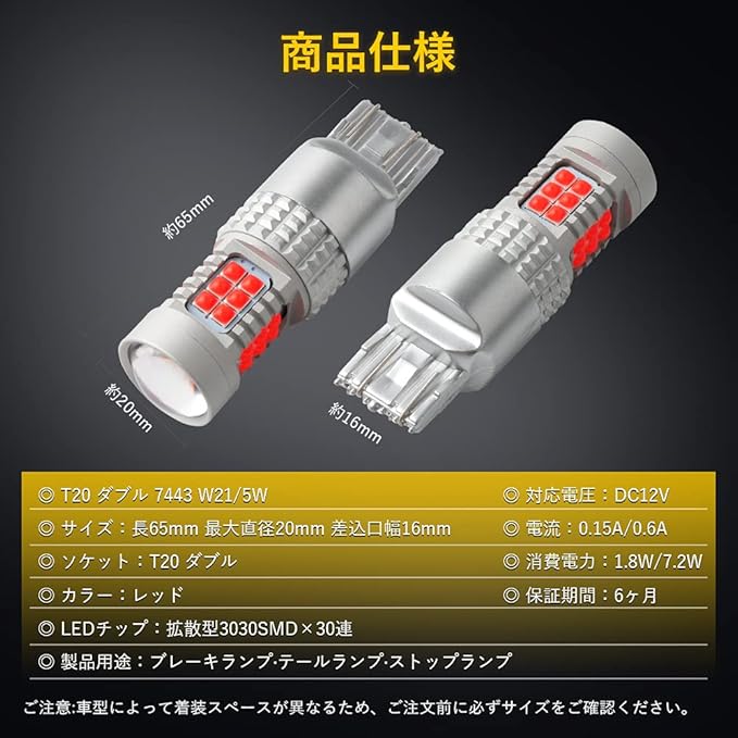【仕様】 規格:T20 ダブル 7443 W21/5W / 消費電力:1.8W/7.2W / 電圧:DC12V / 発光色:レッド / チップ採用:拡散型3030SMD / チップ数:30連 / サイズ(約):全長65mm 最大直径20mm 差込口幅16mm / 製品用途:ブレーキランプ テールランプ ストップランプ