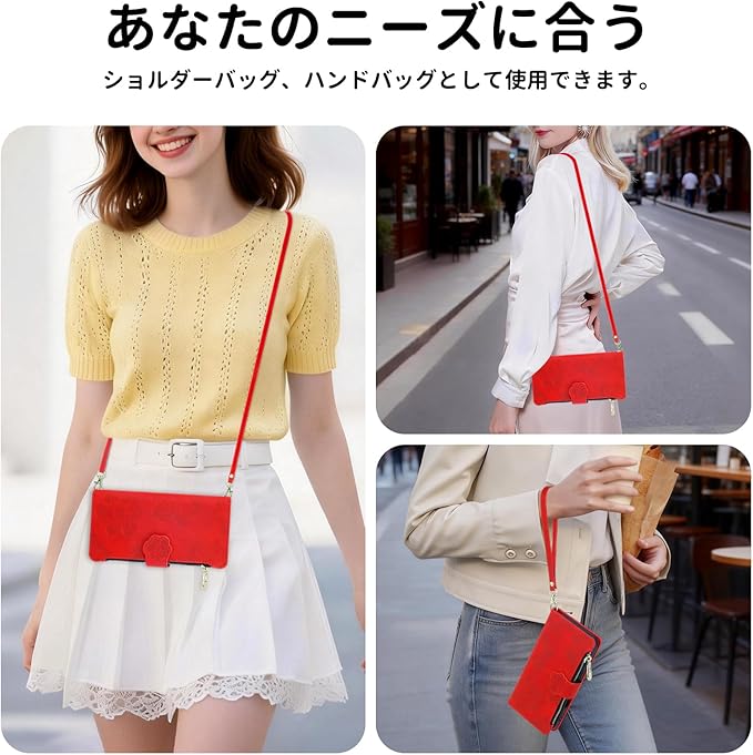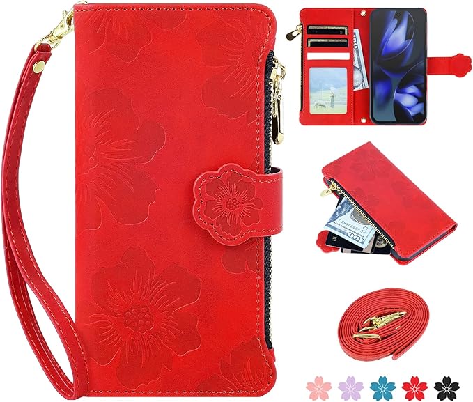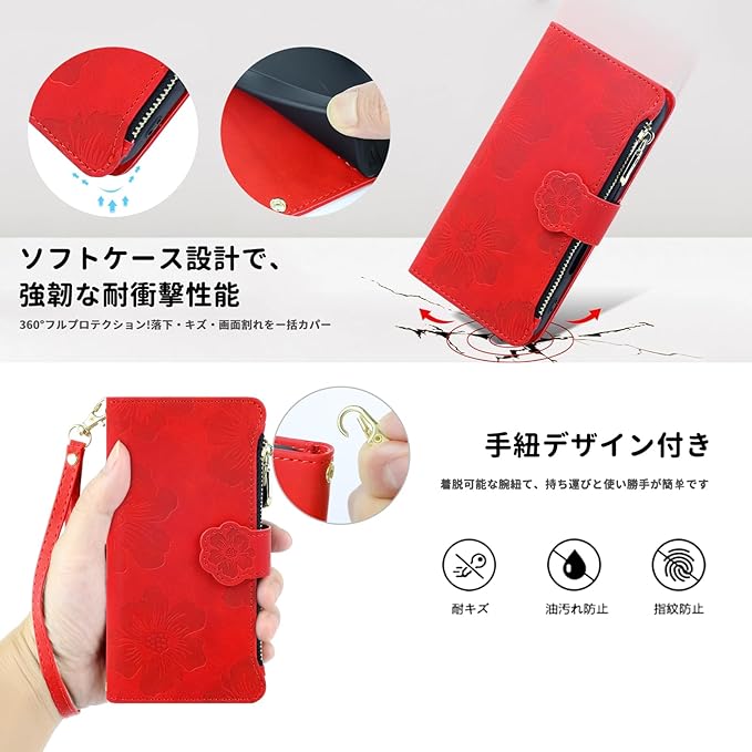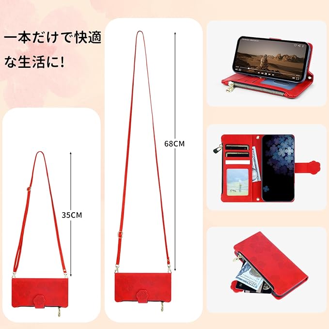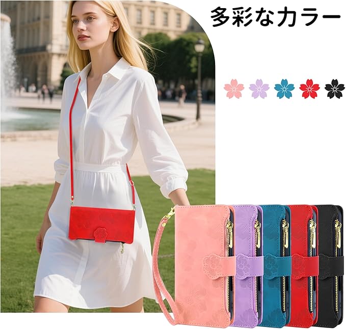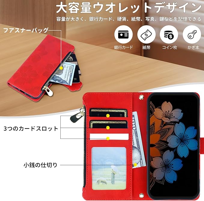 CASAFUNY 適用【Google Pixel 9a ケース 手帳型 ショルダー】スマホケース 肩掛け 斜めがけ 手首かけ、掛けストラップ付き 長さ調整可能 適用 グーグルピクセル9a ケース 手帳型 ファスナー型 小銭入れ 大容量 カード収納 財布型 耐衝撃 本革レザー 用の Pixel9aカバー かわいい 美しい桜の柄 携帯カバー マグネット式 スタンド機能(6.83インチ)あか
