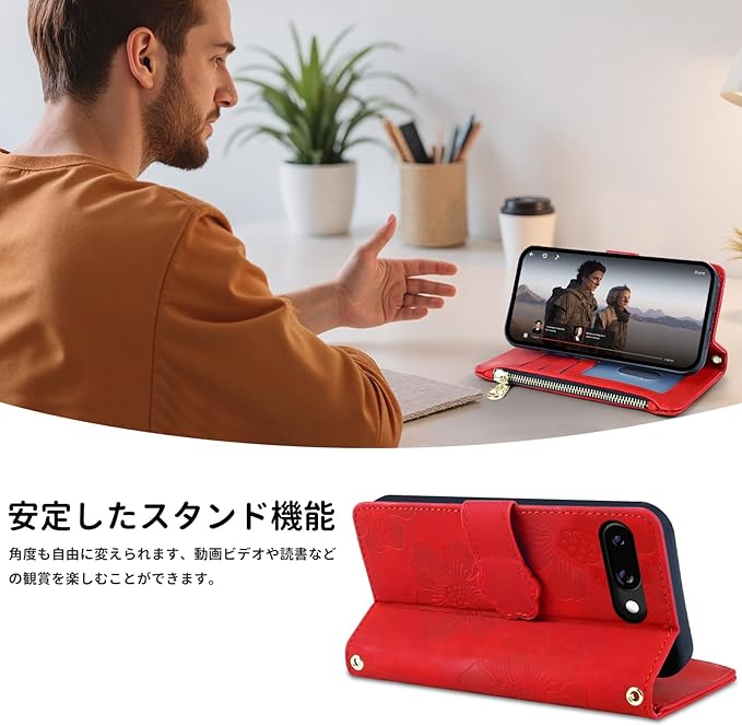 【マグネット・スタンド機能】適用 スマホケースぴくせる9aマグネット式のデザインなので簡単に操作でき、片手での操作にも便利です。カバンやポケットに置いても、マグネットでしっかりしているので、スマホを保護しながら、ケースが開いてしまうことも心配はありません。適用 google ピクセル9a ケーススタンド機能を搭載しており、お好きな角度を調整でき、両手が解放され、お気軽に読書や動画視聴を楽しむことができ、特に新幹線や飛行機内での長距離移動の場合におすすめな適用 google pixel 9a カバーです。快適な視聴体験を提供し、手の疲れを解消します。