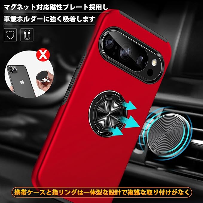 対応 Google Pixel 10 / Pixel 10 Pro 用の ケース リング 耐衝撃 米軍MIL規格取得 TPU+PC 衝撃吸収 カバー レンズ保護 リングつき 指紋防止 360 回転 車載ホルダー対応 スタンド機能 防塵 薄型 落下防止 擦り傷防止 10/10 Pro 携帯電話カバー 赤C85-pix10-02