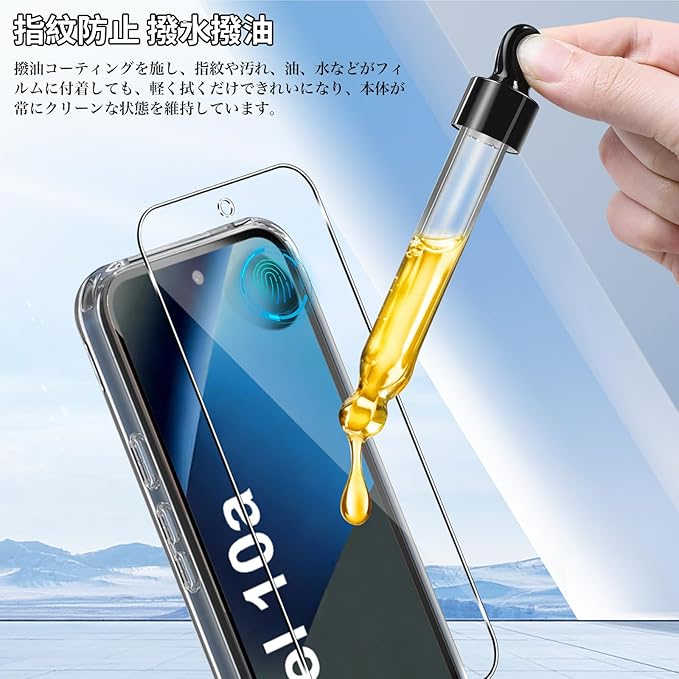 【汚れに強い】撥水・撥油加工が指紋や皮脂の付着を防ぎます。フィルムの表面には様々な特殊加工が施されており、油分、ほこり、指紋に強く、スマートフォンを常に清潔な状態に保ち、見た目の美しさや画面体験にも影響を与えません。頻繁にスマホを拭かないようにします。