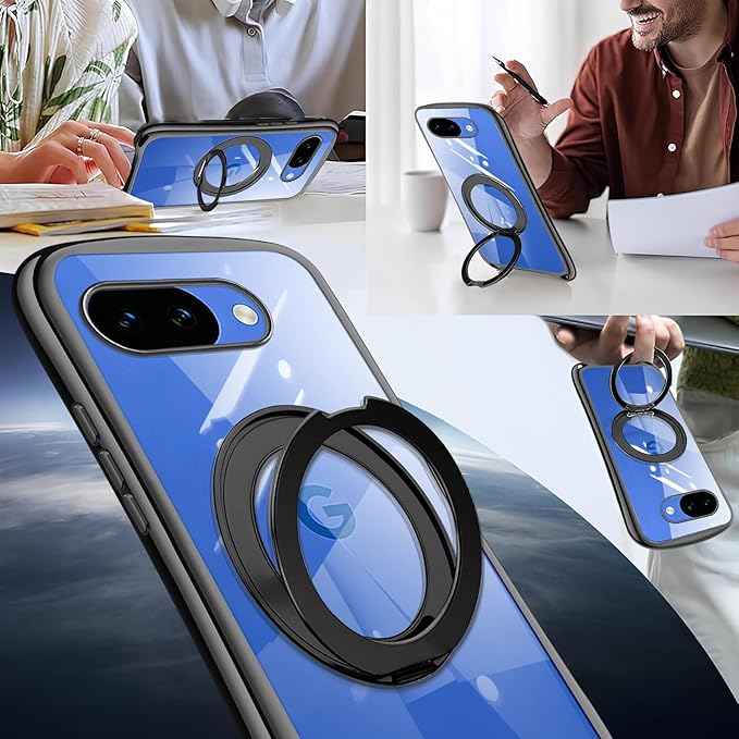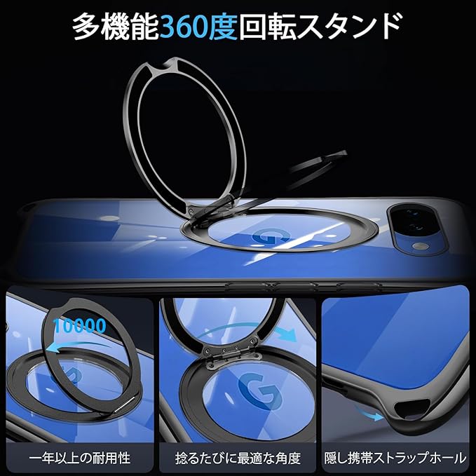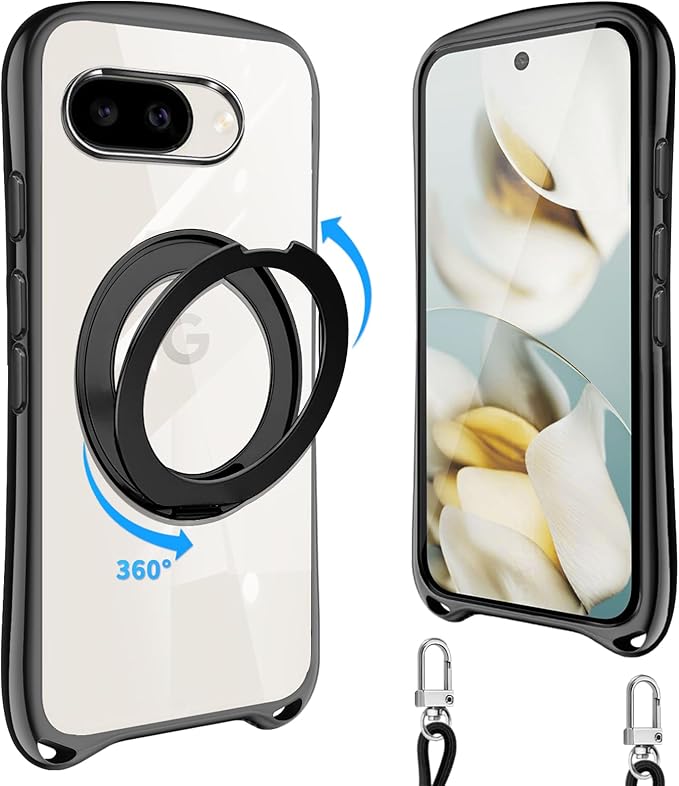 Google Pixel 10a 用の ケース クリア リング付き ショルダー 多機能360度回転スタンド ピクセル10a スマホケース カバー 耐衝撃 透明 TPU 肩掛け 首掛け スタンド機能付き マグネット 金属ボタン(ブラック)