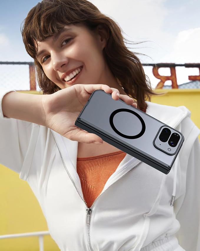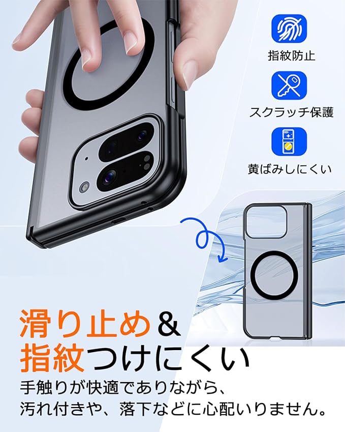 「背面半透明バックデザイン&保護性能」:背面はクリアに設計され、本体の美しさそのまま表現されます。ヒンジカバーで保護するとともに、折り畳むことに邪魔はなし。