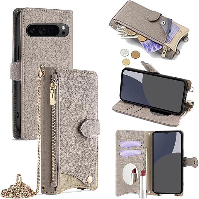 For Google Pixel 10 Pro XL ケース 手帳型 ショルダー For グーグル ピクセル10プロXL カバー 財布型 肩掛け 横+縦 2掛け方 斜めがけ 化粧鏡付き おしゃれ ジッパー小銭入れ カード収納 横置き ロングストラップ 耐汚れ PUレザー 防指紋 高耐久性 女性用 贈り物 COCOCLOUD グレー