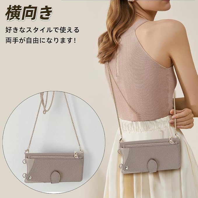 快適な持ち心地と使いやすさ: 付属クロスボディチェーン、全長120 cm。金具の装飾が美しさと上品さを漂わせてます。斜めがけ、肩掛け、通勤、旅行、犬の散歩、山登り、海へ行く、買い物、外食、重い荷物を持っている時、子供を連れて外出する時もスマホを紛失すること心配なく両手が解放されます。また、マグネット式の留め具により、片手で簡単に開閉ができ、スタンド機能も兼ね備えています。