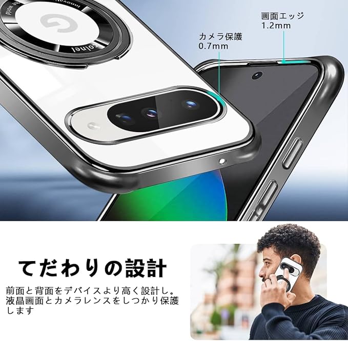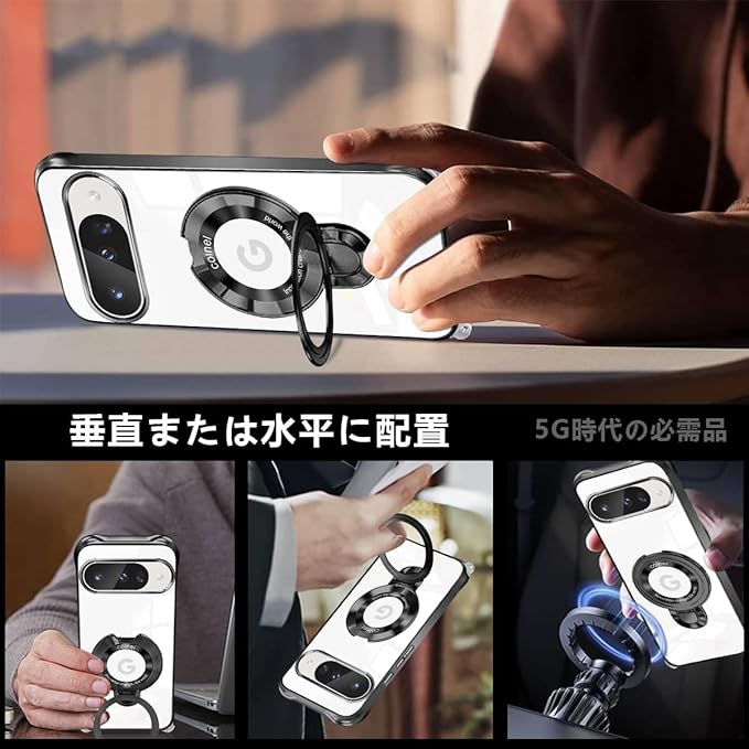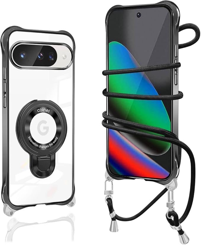 Google Pixel10 ケース クリア ショルダー 透明 グーグルピクセル10 カバー リング付き Pixel 10 Proカバー スタンド機能 マグネット搭載 耐衝撃 米軍規格 紐付き 斜めがけ 織りストラップ付き ネックストラップ ショルダー 縦/横 2WAY 長さ調整可能 取り外し可能 落下防止 紛失防止(ブラック)